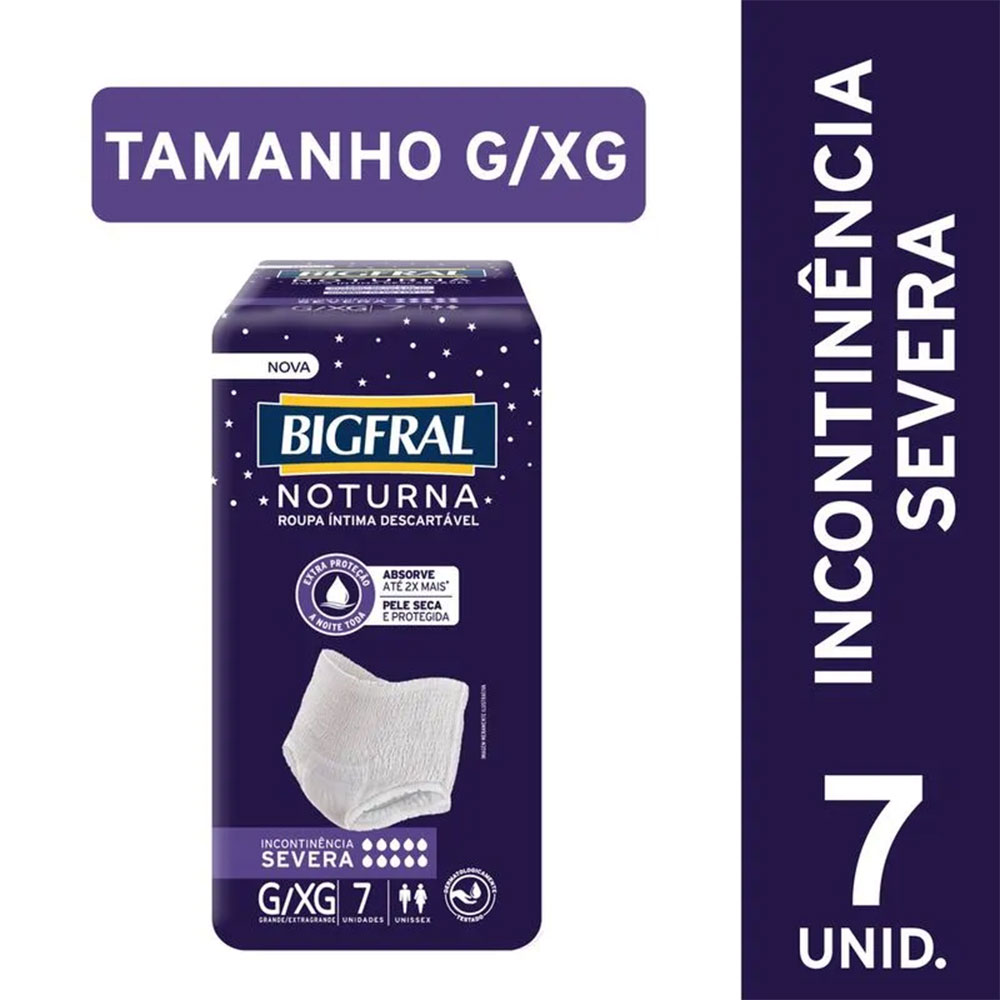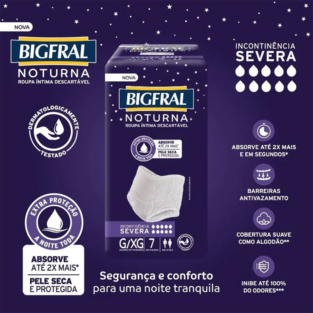 Bigfral Noturna Roupa Íntima Descartável G-XG 7 Unidades. A Bigfral Noturna Roupa Íntima Descartável é ideal para incontinência severa e pós-parto, desenvolvida para homens e mulheres. Por absorver em segundos e até duas vezes mais, mantém a umidade longe da pele. As barreiras antivazamento trazem extra proteção a noite toda. Sua cintura elástica favorece movimentos livres e seguros e a cobertura suave como algodão garante mais conforto durante o sono.
