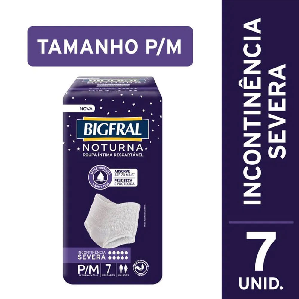 Bigfral Noturna Roupa Íntima Descartável P-M 7 Unidades. A Bigfral Noturna Roupa Íntima Descartável é ideal para incontinência severa e pós-parto, desenvolvida para homens e mulheres. Por absorver em segundos e até duas vezes mais, mantém a umidade longe da pele. As barreiras antivazamento trazem extra proteção a noite toda. Sua cintura elástica favorece movimentos livres e seguros e a cobertura suave como algodão garante mais conforto durante o sono.